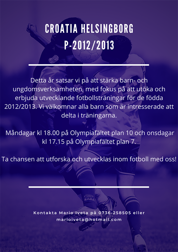 Är du den som brinner för ungdomarnas utveckling inom fotboll? Då har du hittat rätt! Vi är en liten förening som gärna vill utvecklas. Vårt fokus är gemenskap för att stärka tryggheten och intresset kring fotbollen hos ungdomen i vår familjära förening. Vårt ansvar är att du som huvudtränare för 2012-2013 ska känna dig trygg i din roll och få den möjligheten att utvecklas som människa och tränare. Vi vill att du blir en förebild för våra ungdomar och skapa möjligheter för fler barn och ungdomar i Helsingborg att få hålla på med fotboll. Vi tillhandahåller träningskläder och relevanta utbildningar för att säkerställa att du har de färdigheter och kunskaper som behövs för att utveckla våra ungdomar. Vi är dessutom just nu i behov av två assisterande tränare som kan vara behjälplig till den huvudansvariga tränaren men också arbeta, förbereda och leda träningar samt matcher tillsammans med den huvudansvarige. Roller som vi söker: En huvudtränare till ungdomar födda 2012-2013. En assisterande tränare till ungdomar födda 2012-2013. En assisterande tränare till ungdomar födda 2010. Om du delar vår passion och vill vara en del av detta historiska initiativ, skicka ditt CV eller anmälningsformulär till vår engagerade sportchef, Mario Iveta, som gärna bokar ett möte för mer information om föreningen och laget. Kontakta Mario Iveta på 073-625 85 05 eller marioiveta@hotmail.com. Croatia Helsingborg KIF 1 feb 2024 0kommentarer