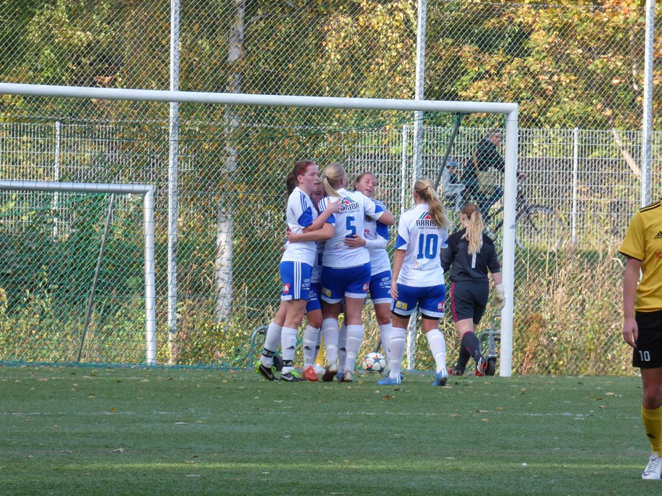 Rönninge/Salem - Dalhem 1-7 (1-2) 0-1 (5) Alma Nygren - assist Agnes Olsson 1-1 (14) Nicole Lundqvist 1-2 (21) Alma Nygren - assist Louise Ruthström 1-3 (59) Alma Nygren - assist Viktoria Nygren 1-4 (64) Agnes Olsson - assist Moa Olsson 1-5 (77) Emma Gottfridsson - assist Viktoria Nygren 1-6 (87) Elin Lindblom - assist Viktoria Nygren 1-7 (90+1) Alma Nygren - utan assist Laget: Målvakt: Amanda Rohnström Backar: Ebba Kellström, Hilda Nygren, Agnes Kolmodin och Viktoria Nygren Mittfältare: Anna Carlsson, Frida Erlandsson, Frida Starkenberg (K), Alma Nygren Forwards: Agnes Olsson och Louise Ruthström Avbytare: Emma Gottfridsson, Matilda Larsson, Elin Lindblom och Moa Olsson. En lite konstig första halvlek där vi är det spelförande laget men där Rönninge/Salem får en del chanser främst att vi blir lite slarviga på egen planhalva. I den 5:e minuten får Alma Nygren bollen av Agnes Olsson på vänsterkanten på egen planhalva och helt enkelt drar ifrån backlinjen med bollen och slår in 0-1. I den 14:e minuten stressar vi vid en rensning och Rönnige/Salems bästa spelare Nicole Lundqvist gör 1-1 i friläge. Lite tidigare borde det ha varit gult kort på en Rönninge/Salem-spelare som trampar vår målvakt Amanda Rohnström onödigt på handen när Amanda har tagit bollen. Den för dagen riktigt dåliga domaren blåser först inte frispark ens!!! I den 21:a minuten får Alma Nygren en fin passning från Louise Ruthström där Alma skjuter ett direktskott som målvakten räddar men Alma slår in returen till 1-2. Dessutom blåser domaren nästan aldrig för knuffar i ryggen, en företeelse som tyvärr verkar bli vanligare och vanligare bland domare i dammatcher. I slutet av halvleken går Hilda Nygren upp för att nicka och blir påsprungen av samma spelare som borde fått gult kort mot Amanda men får inget kort denna gång heller och där förstod man att vi absolut inte skulle få något av domaren för dagen. Hilda var tvungen att kliva av och då fick vi flytta ner Louise Ruthström som back igen och Moa Olsson fick äntligen komma in på planen i en seriematch med A-laget. Att hon tog för sig på ett bra sätt märks senare i texten. I halvtid pratar vi bara om att bli lite resolutare på egen planhalva och att sedan jobba vidare på samma sätt i anfallsspelet då vi kände att vi hade ett klart grepp om matchen. Efter en liten stund av andra halvleken måste tyvärr R/S målvakt utgå på grund av skada och när Nicole Lundqvist ställer sig i mål tar vi över matchen totalt. 1-3 gör Alma Nygren efter en passning från Viktoria på vänsterkanten där Alma Nygren driver in i straffområdet och säkert sätter bollen. I 64:e minuten jobbar debutanten Moa Olsson loss bollen till sin syster Agnes Olsson som slår in 1-4. 4 minuter senare kommer nästa bevis på att domaren definitivt inte är på vår sida. Agnes Olsson blir lite upphakad i straffområdet och gör allt för att hålla balansen men efter 5-6 stapplande steg ramlar hon omkull. Då visar domaren gult kort för filmning!!! Helt otroligt mot en spelare som så tydligt försöker stå upp. Emma Gottfridsson gör sitt första "A-lagsmål" i seriespelet där hon i en tilltrasslad situation nickar in 1-5 efter inlägg från Viktoria Nygren. I 78:e minuten vill domaren visa upp sig igen och återigen ett domslut mot oss. En R/S-spelare får bollen efter en jätteoffside men det missar domaren och när Amanda Rohnström är ett steg efter och hakar upp offsidespelaren blir hon utvisad för målchansutvisning. Ebba Kellström får order att ställa sig i målet. Sista 10-12 minuterna får Elin Lindblom (som kom till oss i augusti) chansen att debutera i vårt A-lag och hinner med att göra sitt första mål i den 87:e minuten när hon säkert sätter friläget efter lyftning från Viktoria Nygren. I den 91:a minuten snor Alma Nygren bollen från en försvarare och slår in 1-7 och avslutar målskyttet i serien. Claes Pettersson