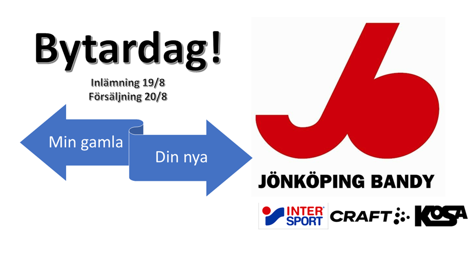 Nu är det nära att bandysäsongen drar igång och det kanske har blivit dags att uppdatera utrustningen i takt med att barnen växer. Därför tänkte vi anordna en ”bytardag” nere på Råslätts IP och tanken är att man kan lämna in bandyrelaterade grejer som någon annan kanske kan köpa, exempelvis urvuxna skridskor, skydd, byxor, träningströjor, hjälmar, klubbor som annars bara ligger och skräpar i förrådet. Upplägget är att vi tar emot och ser till att sakerna som lämnas in blir märkta med säljarnummer och prislapp. Under lördagen säljer vi grejerna och ser till att rätt peng kommer till rätt säljare. För detta tar vi 30% av köpeskillingen som går direkt till Jönköping Bandy. Vill man så kan man skänka en högre andel alternativt hela beloppet till Jönköping Bandy NYTT för i år är att Intersport kommer vara på plats så sälja nya bandysaker och man har möjlighet att prova JBs profilkläder från Craft. När: Inlämning sker fredag 19/8 kl. 17.00-18.30 Försäljning sker lördag 20/8 kl. 10.00-11.30 Avhämtning av icke-sålda grejer sker på lördag 20/8 kl. 11.30. Var: Klubbstugan på Råslätts IP Säsongsstart i Huskvarna Garden Arena kommer vara 4 september. Vid frågor kontakta: Thomas 0762-75 90 30 eller Oscar 0700-88 96 98