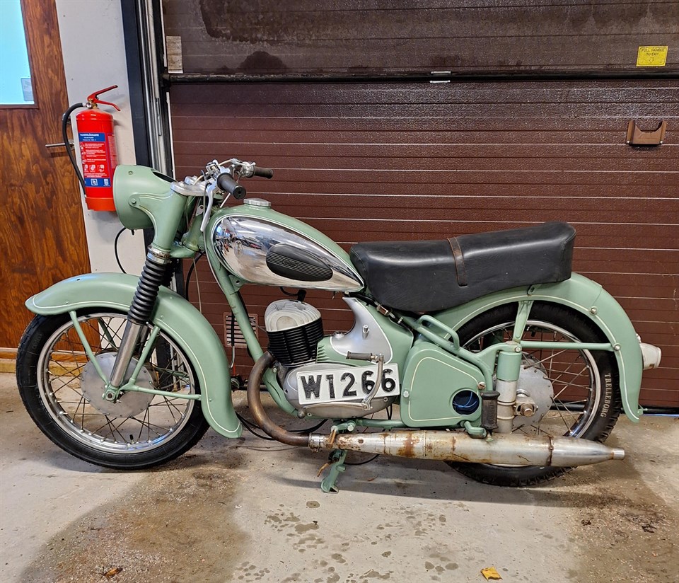 Stig meddelar att när han köpte den så var det ram o hjul, alla övriga delar låg löst i kartonger. Motor var komplett men den har han bytt lager o packboxar på. Tanken är omlackerad, och även skärmarna. Ramen är penselbättrad. Nu återstår eldragning. Den är startad o går bra. Den har varit kvar i registret hela tiden och har en ny skylt från 1991 då den blev avställd. Det som saknas nu är ett signalhorn och DKW märket på tanken. DKW_MC_KLUBBEN 17 dec 2023 0kommentarer