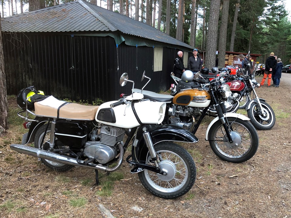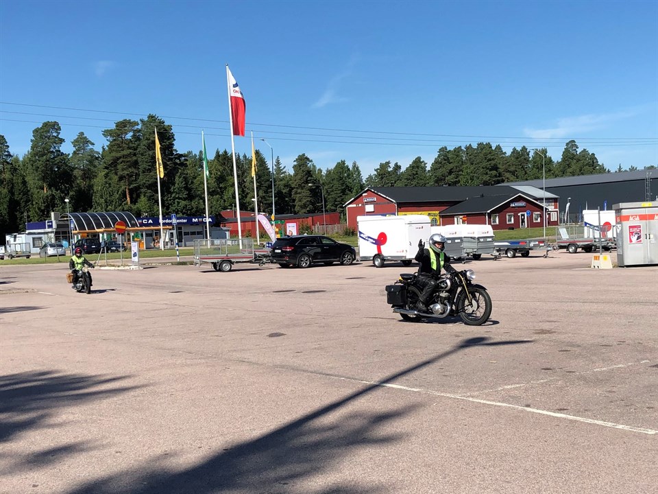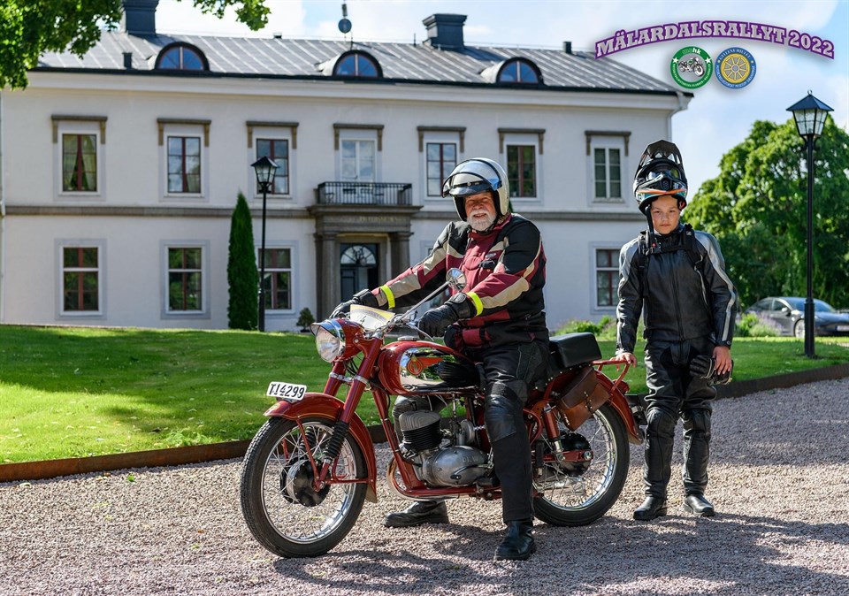 Mälardalsrallyt Surahammar 6/8 startnummer 24/25, Matts Håkansson / Hugo Stridh (13 år) från Sandviken på Mc NV 36 årsmodell 1953 (250 cc DKW motor). Ca 40 motorcyklar anmälda plus 20 mopeder. Banan gick i år norrut genom de gamla järnbruken efter Strömsholms kanal med fikapaus vid Engelsbergs Bruk söder om Fagersta. Mopederna vände här och åkte samma väg tillbaka, medan mc åkarna fortsatte norrut till Västanfors och sedan söderut mot Gunnilbo med avtag mot Ramnäs och åter till målet i Sura. Lite annorlunda upplägg än på övriga rallyn, då man vid kontrollerna endast skulle fylla i en angiven bokstav, som sedan i rätt ordning skulle ge ett ortsnamn i Västmanland, i detta fall var rätt ortsnamn ”Möklinta”. Vid målet fanns i parken vid mc museet ”Gyllene Hjulet” själva frågorna, i det här fallet åtta kryssfrågor plus en utslagsfråga om antal länkar i en mc-kedja. Med så få frågor blev det rätt så utslagsgivande hur många länkar man gissat på. Två frågor var vi säkra på, medan övriga sex fick bli gissningar. Men med skaplig gissning på länkarna blev det en andraplacering i mc klassen och fyra totalt, medan min passagerare kom lite längre ner i listan. Tyvärr höll sig inte det fina med lite blåsiga vädret ända fram, utan målgången skedde i spöregn och åska. Ganska besvärande att skriva och svara på frågor när regnet öser ner och blixtarna for runt omkring oss, men arrangörerna hade gjort det bra med tält uppsatta där vi serverades en god lunch i form av lasagne i varsin matlåda. Rekommenderar fler att åka detta rally ett kommande år. Matts Håkansson