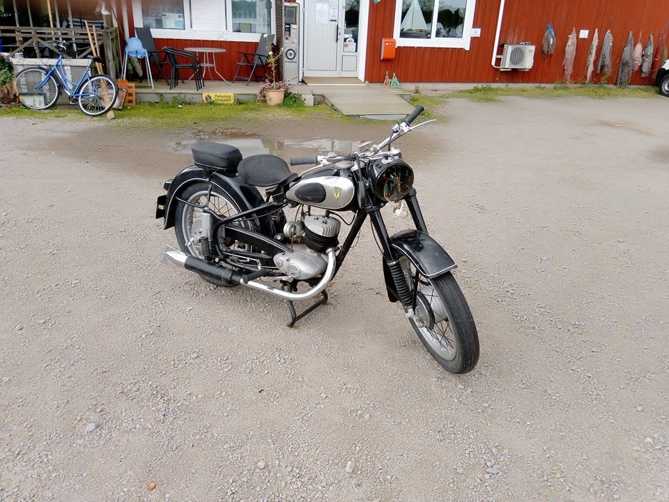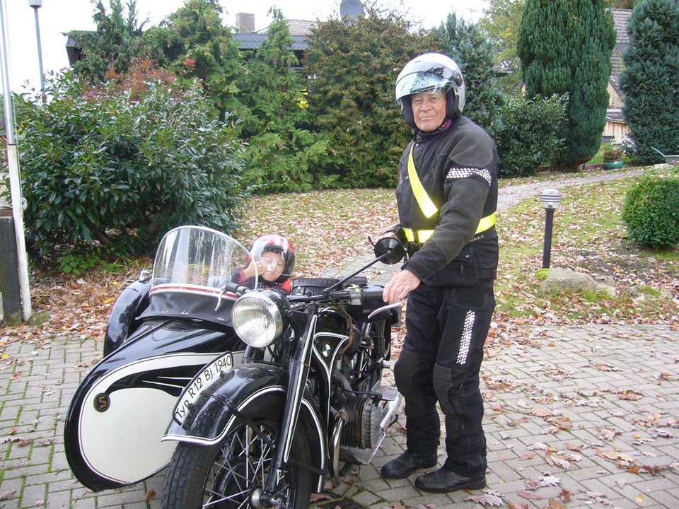 Hej DKW vänner! Gjorde en 4 mils säsongavsluts utflykt med grannes son i Stoye sidovagn (1938). BMW R12, (1940), produktionstid 1935-1941, 750 cm³, sv, 18 hk. Först mc med hydrauliska stötdämparer inom telegaffel. Mest tillverkad 2 cylinder BMW modell före kriget, nämligen 36 000 st Många hälsningar från Barwedel Reinhard DKW_MC_KLUBBEN 27 okt 2019 0kommentarer