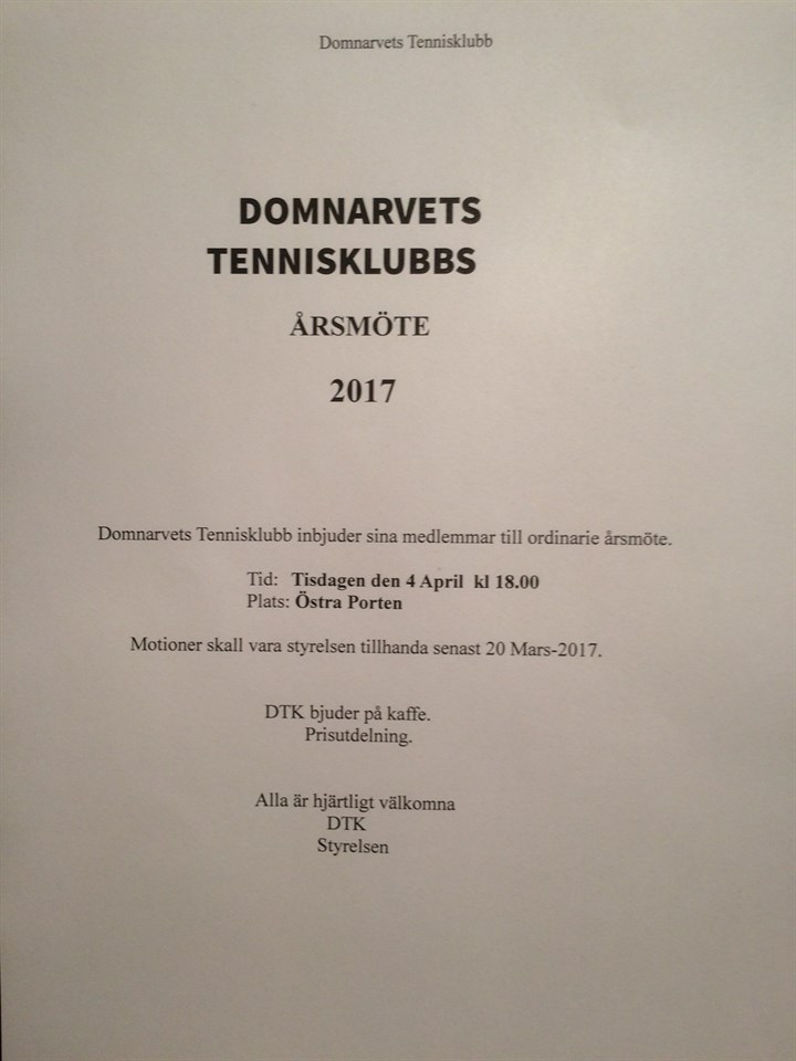 DOMNARVETS TENNISKLUBBS ÅRSMÖTE 2017 Domnarvets Tennisklubb inbjuder sina medlemmar till ordinarie årsmöte. Tid: Tisdagen den 4 April kl 18.00 Plats: Östra Porten Motioner skall vara styrelsen tillhanda senast 20 Mars-2017. DTK bjuder på kaffe. Prisutdelning. Alla är hjärtligt välkomna DTK Styrelsen Blandat 20 feb 2017 0kommentarer
