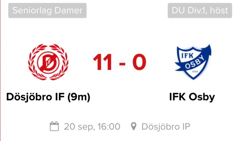 Damer U tog i eftermiddag en storseger hemma på Dösjöbro IP. Matchen mot IFK Osby slutade 11-0 efter 7-0 i paus. Freja gjorde fem mål och comebackande Nanna gjorde tre. DIF:s trupp: Maria Svensson (k) - Alice Larsson (F01/02), Karolina Börjesson, Erna Jonsdottir, Mikaela Platzack, Freja Schött, Jenny Persson, Josefine Troneby, Nellie Karlberg, Nanna Elfström, Angelica Asplund. Avb Julia Johansson, Hanna Rosenqvist (F01/02), Josefine Carlsson Dösjöbro IF Dam U - IFK Osby U 11-0 (7-0) 1-0 4 min Jenny Persson (Nanna Elfström) 2-0 9 min Nanna Elfström (Jenny Persson) 3-0 25 min Freja Schött (Hanna Rosenqvist) 4-0 30 min Jenny Persson (Hanna Rosenqvist) 5-0 32 min Angelica Asplund (Josefine Troneby) 6-0 38 min Freja Schött (Alice Larsson) 7-0 44 min Freja Schött (Jenny Persson) 8-0 70 min Freja Schött (Hanna Rosenqvist) 9-0 85 min Nanna Elfström (Jenny Persson) 10-0 89 min Nanna Elfström (Josefine Carlsson) 11-0 90 min Freja Schött (Josefine Carlsson) Mikaela Platzack gjorde debut för DIF i den här matchen, hon har flyttat ner från Växjö men har tidigare spelat i Borgeby tillsammans med flera av tjejerna i DIF-truppen. Dessutom gjorde Nanna efterlängtad comeback efter fotskadan. Och liksom i förra U-matchen var Alice och Hanna R från F01/02-laget med i truppen. Alla gjorde det riktigt bra liksom laget i övrigt. Redan från start togs ordentliga inititativ mot det unga motståndarlaget och det stod tidigt klart åt vilket håll det skulle gå. 1-0 kom redan i den fjärde minuten när Nanna kastade ett snabbt inkast från vänster till Jenny som sköt in bollen i det bortre hörnet förbi målvakten. Vid 2-0 var rollerna omvända, Jenny frispelade Nanna som fick på ett bra skott i nättaket. 3-0 gjorde Freja efter mycket fint förarbete och snett-inåt-bakåt spel från Hanna. Fem minuter senare svarade Hanna för framspelningen på nytt, denna gång till Jenny, som gjorde sitt andra mål för dagen. Ytterligare två minuter senare fick Angelica in bollen efter förarbete från Troneby. 6-0 gjorde Freja via en hemmaförsvarare, efter passning från Alice på högerbacken. Freja gjorde även 7-0 före paus, på nick efter en hörna från Jenny. Målen skulle dröja något i den andra halvleken. I den 70e minuten spelade Hanna bollen diagonalt i djupet från högerkanten. Freja mötte upp från vänsterkanten och rundade målvakten innan hon slog in bollen. Det var Hannas tredje målgivande passning i matchen! 9-0 kom efter mycket fint väggspel mellan Nanna och Jenny i mitten och Nanna kom fri och placerade säkert in bollen i mål. I slutskedet frispelade Josse C Nanna snyggt i mitten och Nanna kom före målvakten och förbi henne och la in bollen. Hattrick! Minuten senare frispelade Josse C även Freja som enkelt slog in sitt femte mål för dagen till slutresultatet 11-0. Damer U har inlett höstserien med tre vinster och en oavgjord och laget ligger delad tvåa i tabellen (Damer U Div 1) efter Sandby/Veberöd som är utan poängförlust hittills. Nästa match spelas måndagen den 28 september kl 19.15 mot Vittsjö GIK hemma på konstgräset. Välkomna då!