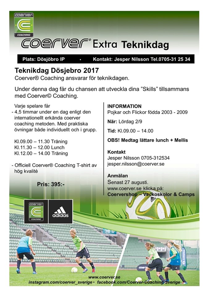 Vi har fått möjlighet att få vara med på en utbildningsdag med externa professionella tränare där fokus är på teknik och individuell utveckling. Mer information på länken! Åldersgrupp: Pojkar och flickor födda 2003-2009. Finns begränsad plats men DIF medlemmar har förtur till den siste juni. Frågor besvaras av Thomas Ljungdahl. Mvh Dösjöbro IF Ledare 16 jun 2017 0kommentarer