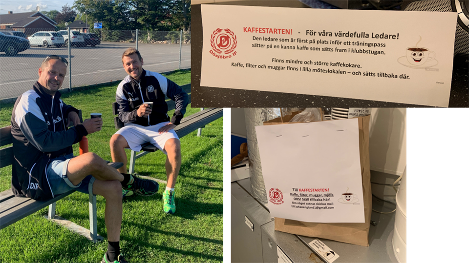 Då var Kaffestarten igång! Måndagar 17.25 står där nybryggt kaffe utanför klubbstugan. Ta en kaffe och snacka lite med kollegorna innan ni drar igång träningen. Övriga dagar går det jättebra att första man/kvinna på plats sätter på en kanna, även inför det andra träningspasset på kvällen. Filter, kaffe etc står i lilla mötesummet. Inne i klubbstugan finns en mindre och en större kaffekokare. Hittills har det räckt med den lilla. /Ungdomsgruppen