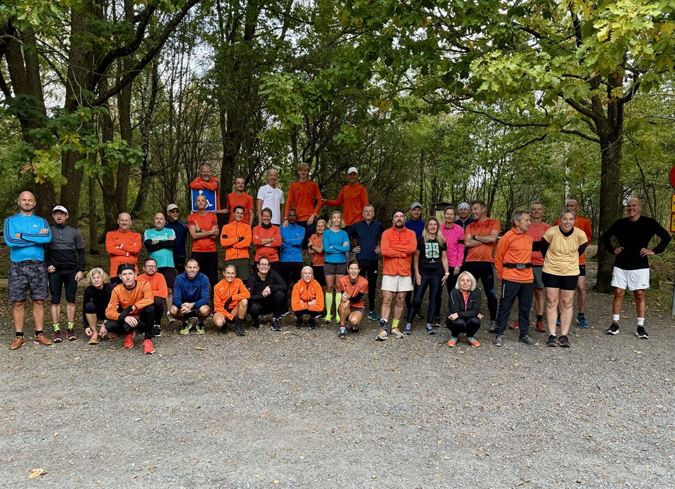Lördag morgon, samling vid Kungsbacka ridklubb kl 8:45 för att springa en riktig skitrunda...eller inte riktigt. Vi kallar ju den deponirundan för att den passerar förbi Barnamossen. 40 löpare och vandrare var sugna denna fina höstmorgon när det var lite kyligt. 5 grader, men solen lyste och man visste att det skulle bli lite varmare. En riktigt härlig höstmorgon. Samling framför stallporten och lite info samt obligatoriskt foto. Därefter lite skönsång för dagens födelsedagsfirare, Britt-Marie. Sen sprang vi iväg och en mindre grupp vandrade iväg. Första kilometern var den klart långsammaste. Detta för att det dels gick uppför och dels för att det var lite slirigt med mossa på berghällar. Efter den första kilometern så gick det desto snabbare. Detta för att underlaget mestadels var grusvägar och lite asfalt. Men vändningarna funkade och alla hängde ihop även om det ibland blev lite utdraget. Men så fort det blev lättare att mötas så blev det vändningar. Gott så! Det snackades som vanligt om diverse olika ämnen under rundan. Löpningen avslutade med välförtjänt fika i cafeterian på ridklubben. Gott att avsluta med lite kaffe och lite gott snack. Lite lopp i närtid är Finalloppet 2/11 och Sätila trail 9/11. Lopp som brukar locka några löpare från DRT. Ett annat "lopp" som ligger närmre i tiden är Friskis backyard ultra light som är redan imorgon. Start kl 10. Se separat nyhet i DRT-gruppen. Tack för idag alla! Fötti fina friskusar!