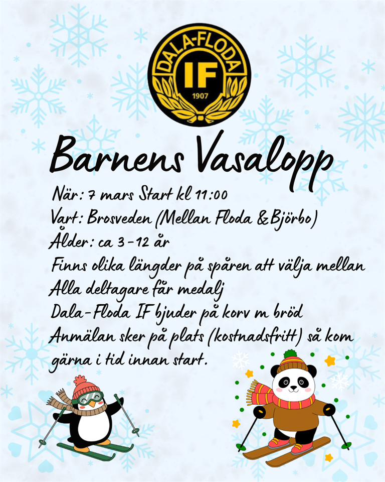 Visste du att du för 150 kronor för enskild eller 300 kronor för en hel familj får tillgång till en massa idrotter med ledare och dessutom ett skidspår med elljus samt en friidrottsanläggning? Under 2025 har Dala-Floda IF ledarledda pass inom: - Fotboll - Futsal - Innebandy - Terränglöpning - Barngympa Missa inte heller vårt fantastiska skidspår med omklädningsrum och bastu för både herr och dam och på Flodavallen finns alla möjligheter till friidrott. Inom skidor och friidrott har vi inte haft ledare på några år men finns det intresserade ledare så finns alla möjligheter att starta upp även dessa grenar inom DFIF igen. Se medlem under www.dfif.se Följs oss gärna på: www.facebook.com/dfif1907 http://youtube.com/dfif1907