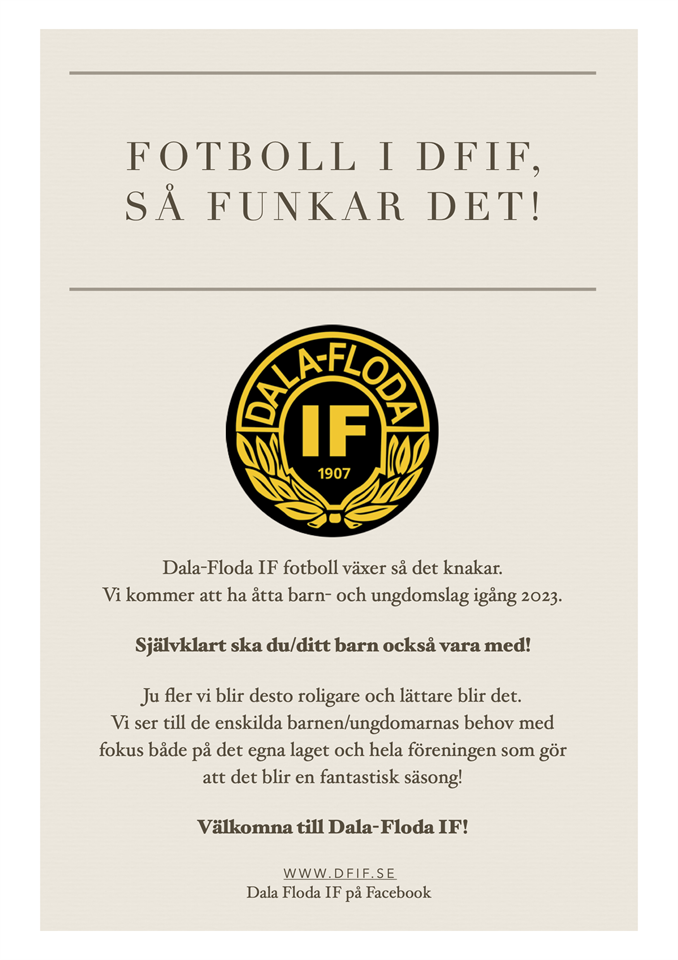 Glad påsk från barn och ungdomsledarna i DFIF! Här kommer lite nyheter Innebandyn avslutas 29/4. Missa inte prova på inför kommande säsong för barn födda 2017-2019. Måndag 15/4 och mån 22/4 klockan 17:00-17:45. Syrholns gymnastiksal. Kontakt: David Levrén. Fotbollen fortsätter växa och kommer med nyheter: - ålderskravet på gåfotbollen förvinner. Nu gäller bara en enkel (?) regel. Gå… inte springa. Klipp från premiären på Flodavallen - vi ska försöka få igång ett rent tjejlag födda runt 2014 - 2015, preppa era barn för uppstarten i maj - vi står och faller med att vi lyckas rekrytera ledare. Framför allt i de yngsta grupperna. Hör av er ni med barn födda runt 2018 – 2020. Prata ihop er, kontakta Pontus Gruhs 070-624 44 50, Marcus Homman 073-925 94 42 eller Jennie Nises: 073-774 75 44 Även för de lite äldre finns behov av ytterligare ledare. Vi planerar en utbildning i vår för alla gamla och nya ledare så passa på. Kontakt: Tjejer född 09–11: Kajsa Eljas, Olle Holman, Roger Homman Killar födda 10–11: Pontus Norman, Linda Skoglund Tjejer födda 12–13: Karin Levrén, Emil Larsén, Calle Ström Killar födda 12–14: Daniel Bergström, Lars Permats Tjejer födda 14–15: Pontus Gruhs, Marcus Homman, Elin Erkers Killar födda 15–16: Emma Enmalm, Pontus Gruhs Tjejer & killar 16–17: Petra Bergström, Emil Håsteen Tjejer & killar 18–19: Vakant Tjejer & killar 19–20: Vakant Fotbollslek: ca 19–20: Jennie Nises + vakant Gåfotboll: kontakt Leif Ragge Olsson, Kjell Eriksson & Kaj Bergström Glad påsk! Dala-Floda IFs Youtubekanal www.dfif.se