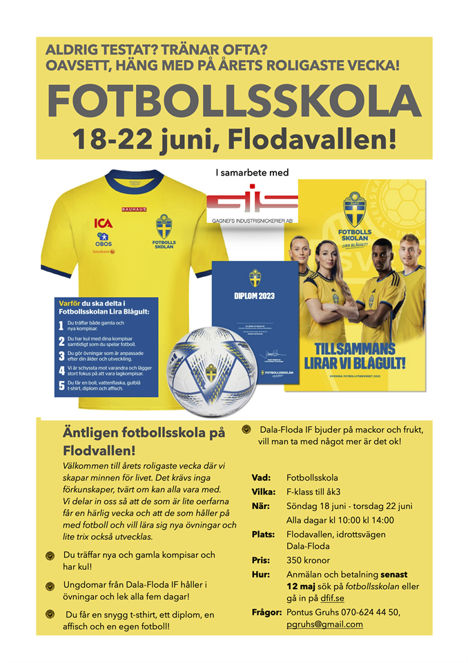 Nu är det dags att anmäla sig till årets roligaste vecka! Svenska fotbollförbundets fotbollsskola för F-klass - åk 3 genomförs på Flodavallen söndag 16 juni - torsdag 20 juni. Alla barn i F-klass - åk 3 (födda 2014 - 2017) är välkomna, oavsett om du spelat fotboll innan eller är helt oerfaren. Syftet är att få fler att prova på fotboll och få de som redan spelar att få extra motivation att fortsätta utvecklas. Barnen kommer att ledas av duktiga ungdomar från Dala-Floda IF som får chansen att utvecklas i sitt framtida ledarskap. DFIFs ledare finns med som mentorer och givetvis finns en vuxen från föreningen med som huvudansvarig i bakgrunden. Att delta kostar 349 kronor och barnen får då en t-shirt, diplom och en alldeles egen fotboll! Vid anmälan ska storlek på t-shirt anges Förra året upplevde flera att t-shirtarna var något små i storleken, vi vet inte hur det blir i år dock. Klicka på länken för anmälan Vid anmälan ska storlek på t-shirt anges Förra året upplevde flera att t-shirtarna var något små i storleken, vi vet inte hur det blir i år dock. Betalning till DFIF (märk betalningen fotbollsskolan och barnets namn: BG 5611-6478 Klicka här för mer information Vad är fotbollsskolan? Kolla förra året här! VÄLKOMNA TILL ÅRETS ROLIGASTE VECKA!