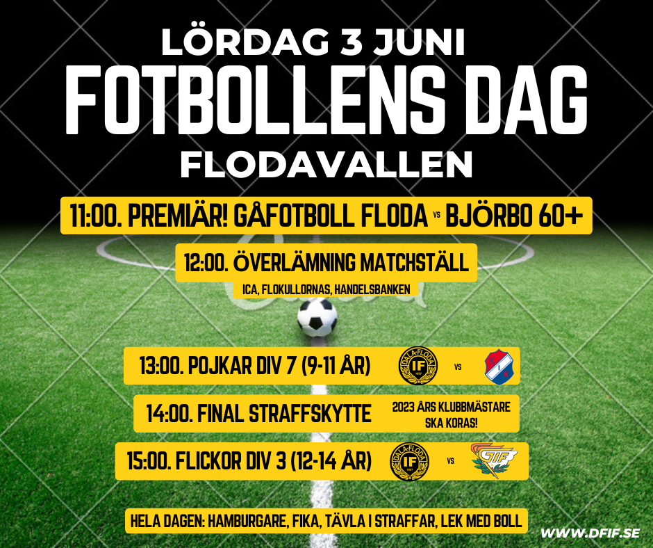Missa inte fotbollens dag 3 juni klockan 11:00 - ca 16:00. o Flera av ungdomslagen spelar sina seriematcher på Flodavallen, o Klubbmästare i straffskytte 2023 ska utses, både barn- och vuxenklass, o Premiär av Gåfotboll med DERBY Floda - Björbo kl 11:00! Kom och titta, kanske blir du 60+ sugen att hänga på? o Nygrillade hamburgare, fika, prova straffskytte hela dagen! VÄLKOMNA!