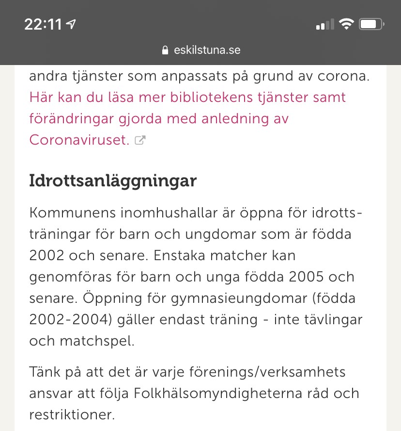 Hej! Fått svar från kansliet nu: Såhär ser nuvarande situation. Ni kan börja träna i Torshargshallen på torsdagar mellan 20.00-21.00 fram tills t.o.m. den 4 november. Därefter flyttar fotbollen in. Till dess har kommunen sagt att de ska skaka fram ytterligare en tid för er. Jag tror din tagg ska fortfarande fungera in till hallen. *************** Så med andra ord kan vi köra igång med start imorgon om vi vill?! Vad säger ni? Dam-motionslag 15 sep 2021 16kommentarer