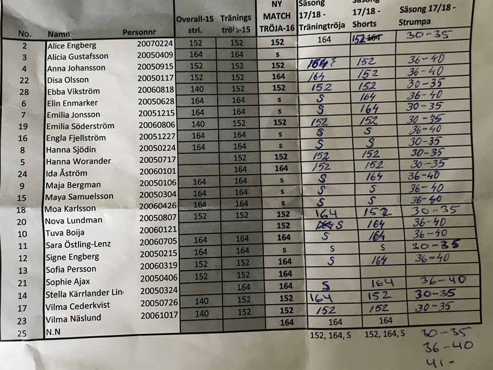 Hej, känns bra att säsongen är igång, roligt att se så många spelare på första träningen igår. Vi provade kläder och i bilden ser ni vald storlek, ni har på er fram till söndag att kompletera/ändra, på måndag lämnas beställning in till Sport & Funktion. Vi beställer en träningströja/extra matchtröja svart, ett par shorts och två par strumpor. Det kommer kosta resp. spelare ca 150 - 200 kr, lite beroende på hur vi lyckas med sponsorer. Fick frågor ang extra shorts och strumpor, det löser ni själv direkt med SPOFUN men kan ju vara lämpligt att invänta denna beställning om ni vill ha samma modell. I närtid fortsätter vi träna onsdagar och fredagar i Höglunda, vi har några träningsmatcher planerad mot Fränsta och Ånge i Fränsta söndag 22 oktober, helgen efter spelas IBF:s egna Himla Cup 28-29 oktober. Vi är anmäld med två lag till seriespel även denna säsong, nytt är att vi inte spelar med båda lagen i samma serie. Inte klart när seriespelet drar igång men planerat i början/mitten på november. Kalendern på Laget uppdateras vart efter. Det kommer bli en del föreningsarbete för föräldrar under hösten, i samband med A-lagsmatcher, Himla Cup och några jobb för att dra in lite pengar till vår lagkassa. Säsongen 17/18 kommer erbjuda mycket innebandy till tjejerna och ledarna samt tillfällen för föräldrarna att träffas via träningar (vi behöver hjälp med sargbygge), matcher och föreningsjobb, det blir kul !!!!! mvh Ledarna
