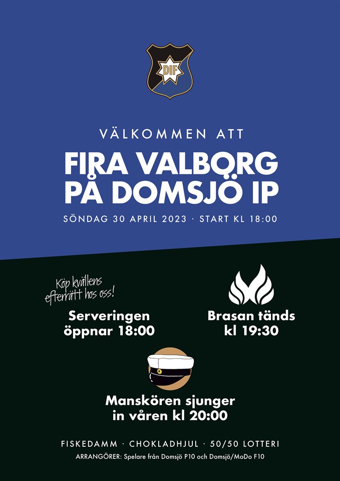 Inbjuder Er alla till Domsjö IP och fira in våren med oss på Valborgsmässoafton, söndagen den 30/4.