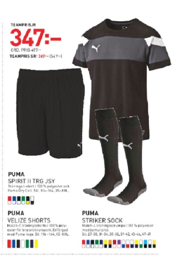 För att kunna beställa träningskläder så sanrt som möjligt skulle vi vilja att alla anger vilken storlek ert barn ska ha på tröja, shorts och strumpor. Skriv det som en kommentar till denna nyhet. Bifogar en bild (dock något suddig) på det träningsställ vi kommer att köpa. Eftersom att vi fått in en del sponsorer kommer vi att kunna reducera priset till 300 kr/barn för träningsställ + ryggsäck. Värt att tänka på är att alla pumakläder vi kollat på hittills är små i storleken. När vi beställde matchställ tog vi 152 i tröjor och 140 i shorts. För att ni ska kunna tänka er ungefärlig storlek, så provade vi 152 på Alex och Liam och de var bra (med lite marginal). Emil fick prova en strl 140 och den var lagom till honom. Vi tog dock 152 till alla för att kunna använda ställen även nästa år. /Ledarna