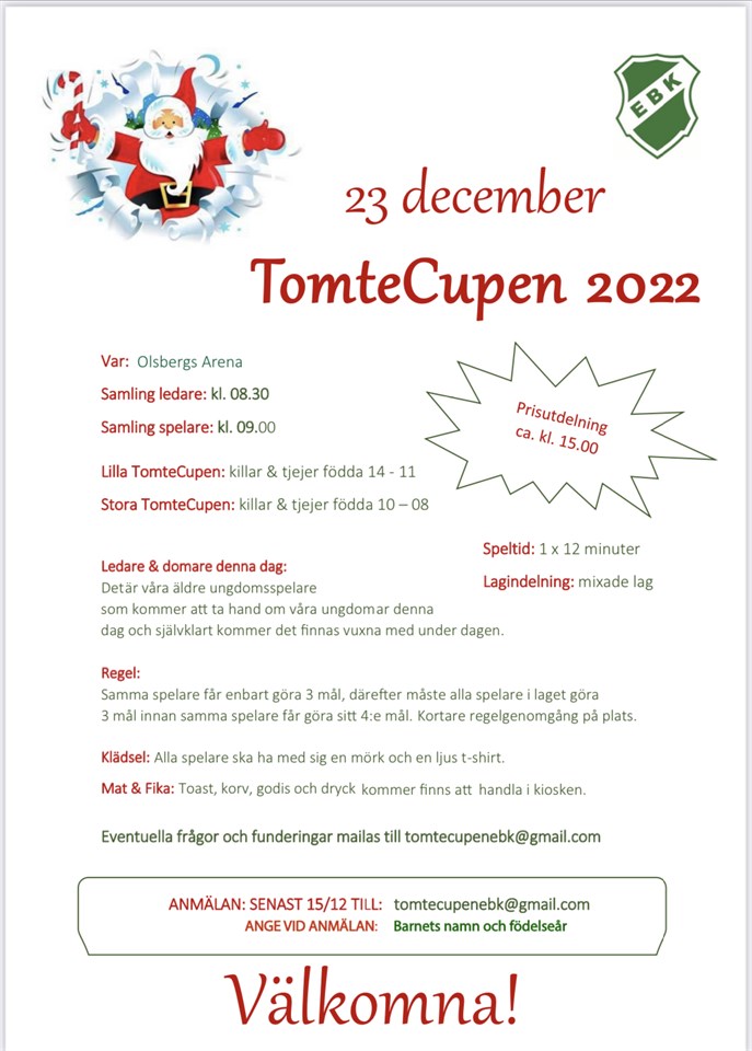 Det finns möjlighet för tjejerna att vara med på Tomtecupen den 23 december. Ni anmäler ert barn själva enligt inbjudan. (Bifogad bild) Tyvärr har inte vi tränare möjlighet att närvara så föräldrarstöd kommer behövas under dagen. F12 - födda 2013 15 dec 2022 0kommentarer
