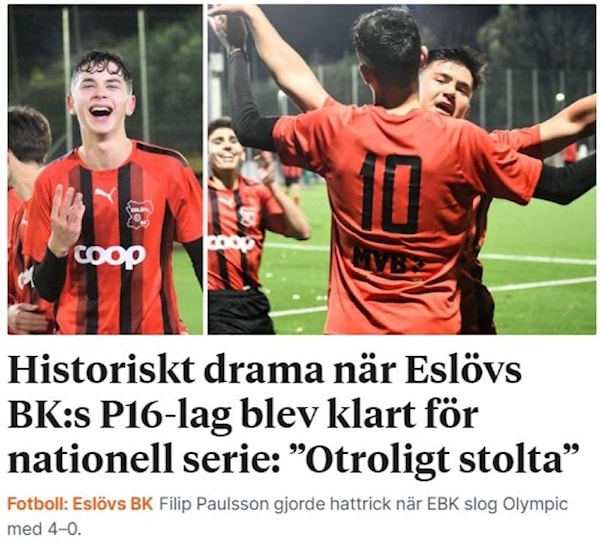 P16 klara för nationell serie 2024"Godmorgon Eslövsbor – och grattis! Era fotbollsungdomar i Eslövs BK skrev historia i går kväll när P16-laget blev klart för nationellt seriespel efter ett osannolikt drama på Lindängen i Malmö. Skånskan var förstås på plats. – Jag är inte helt hundra, men jag tror inte att något annat ungdomslag i Eslöv eller för den skull i Mellanskåne, tidigare spelat i en nationell serie. Inte vad jag kan minnas i varje fall, log Jörgen Thulin som tränar laget tillsammans med Fredrik Paulsson och Magnus Parente."