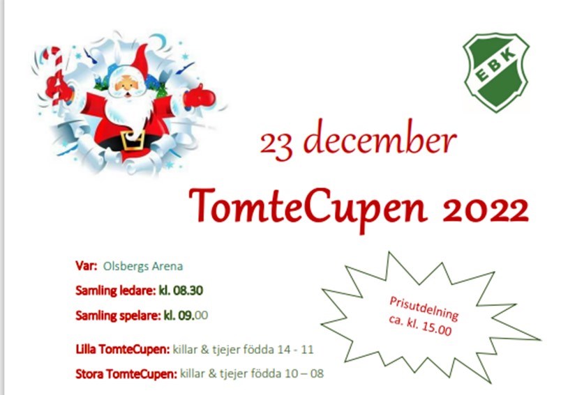 In och anmäl er! När: 23 december Var: Olsbergs Arena Samling ledare: kl. 08.30 Samling spelare: kl. 09.00 Lilla TomteCupen: killar & tjejer födda 14 - 11 Stora TomteCupen: killar & tjejer födda 10 – 08 Klädsel: Alla spelare ska ha med sig en mörk och en ljus t-shirt. Mat & Fika: Toast, korv, godis och dryck kommer finns att handla i kiosken. ANMÄLAN: SENAST 15/12 TILL: tomtecupenebk@gmail.com ANGE VID ANMÄLAN: Barnets namn och födelseår Ledare & domare denna dag: De är våra äldre ungdomsspelare som kommer att ta hand om våra ungdomar denna dag och självklart kommer det finnas vuxna med under dagen. Speltid: 1 x 12 minuter Lagindelning: mixade lag Eventuella frågor och funderingar mailas till tomtecupenebk@gmail.com Välkomna! P13 - födda 2012 2 dec 2022 0kommentarer