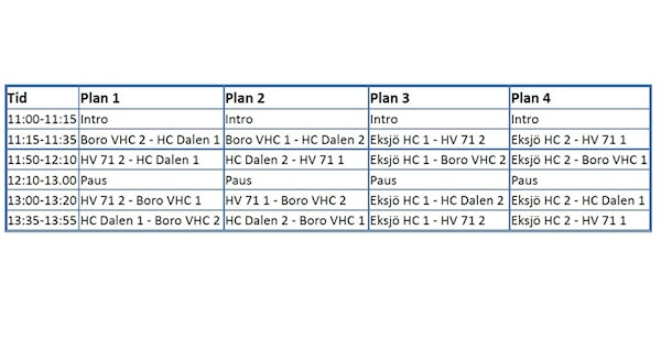 Alla lag kommer spela 4 matcher (20 minuter) med en paus på 50 min efter två spelade matcher. Vi kommer även börja med ett intro för samtliga lag. Nya riktlinjer innebär tutljud vid byten samt igångsättande. Byten ska ske med 60 sekunders intervall.