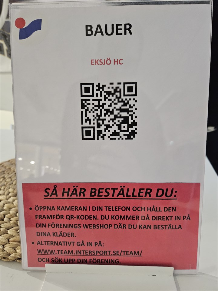 Hej! Nu finns det möjlighet för alla att beställa kläder via Eksjö HC på Intersport. Kläderna är av märket Bauer. Eksjö HC får en slant för alla de kläder som säljs, köp sponsrar alltså klubben. Om ni vill se vilka kläder som finns för beställning följ QR koden på bilden, där ser ni även priser. Det är också via denna länk ni gör er beställning. Det finns kläder, prylar, väskor mm. för både barn och vuxna. Kläderna finns för utprovning i ishallen (ovanför kiosken), kontakta någon av följande ledare innan träning så släpper vi in er i rummet och hjälper er med utprovningen. Kontakta: - Martin Svensson - Marcus Dahlberg Ha det fint, med vänliga hälsningar, Ledarna