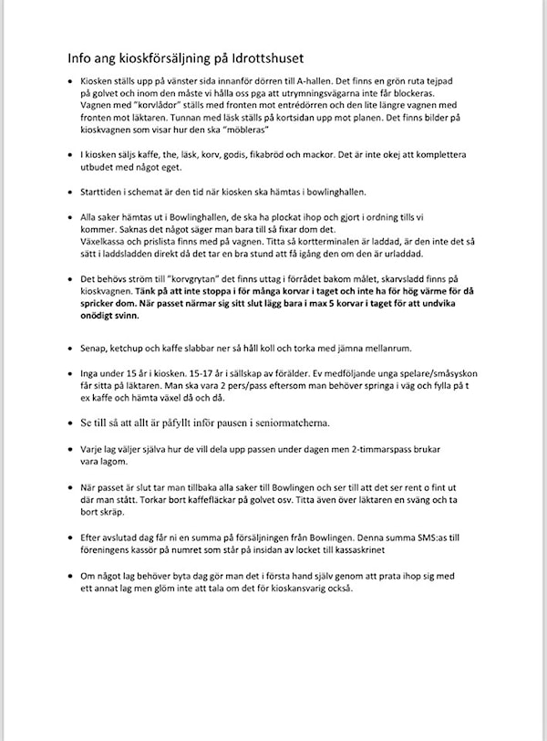 En bit i andra halvlek kan man plocka undan kiosken så passet blir inte så långt som angiven tid. Hoppas denna ändring är ok för er. Bekräfta gärna på nytt med en kommentar. Jag är med i helgen på miniblixten om ni har några frågor!
