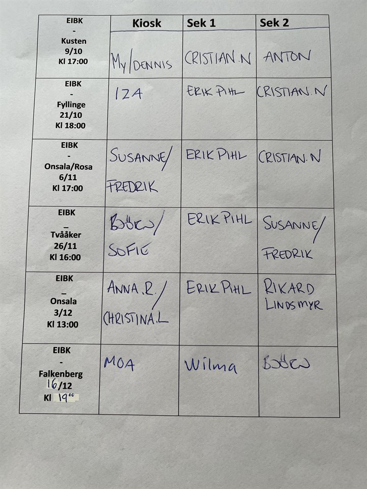 Hej, vi skulle behöva ha 2st lagmammor som hjälper oss att fixa schema för bemanning av kiosk och sekretariat vid matcher. Förra året var Wilmas och Elins mammor, har vi några frivilliga? Annars väljer jag ut 2st som inte varit redan. Mvh