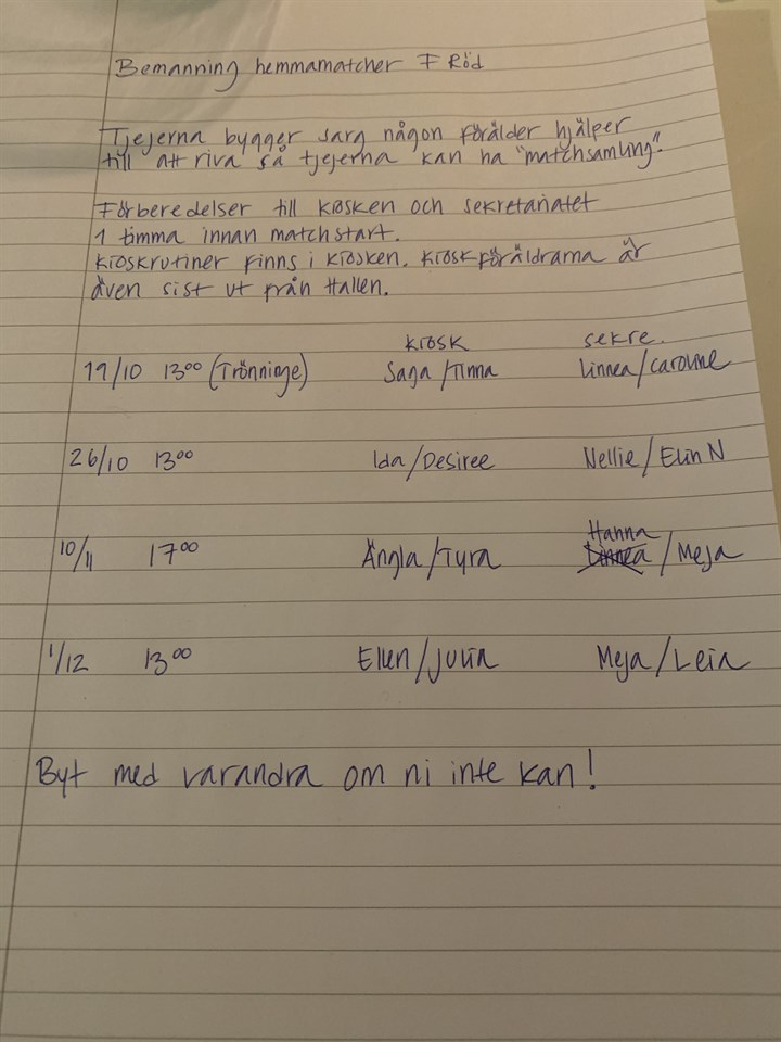 Hej! Vi har valt att ha lagförälder i F06-08 som kommer sköta bemanning i kiosk och sekretariat. Bifogat ser ni en bemanningslista med datum och vilken ”tjänst”. Kan man inte det datumet så löser man det själv genom att byta med någon annan. Tjejerna bygger sargen själva och föräldrar hjälper till att ta ner den efter match. Mvh F0708 13 okt 2019 13kommentarer