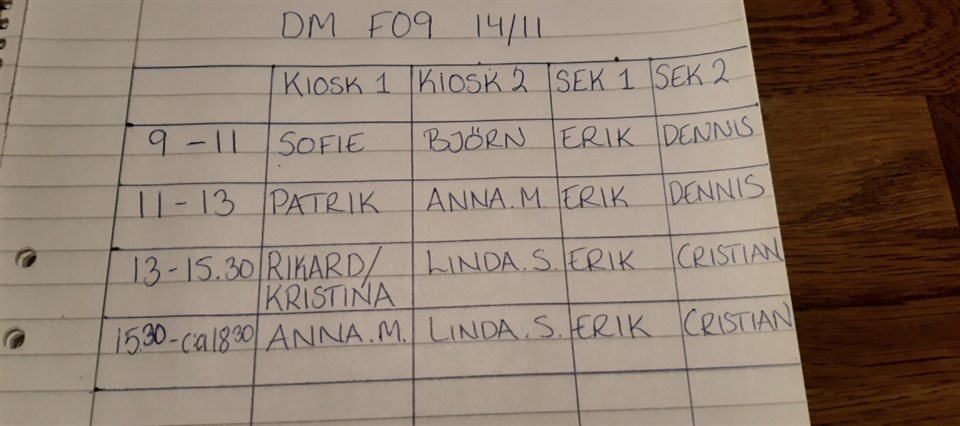 Hej! Söndag 14/11 kommer vi arrangera DM för F09 i Halland. Första matchen börjar kl 09.00 och sen sista matchen går ca 18.00. Vi behöver bemanna sekreteriatet och kiosken hela dagen och behöver hjälp av så många föräldrar som möjligt. Skriv nedan vilka tider ni kan så får lagmammorna göra ett schema på dagen. Spelschema ser ni på länken Spelschema