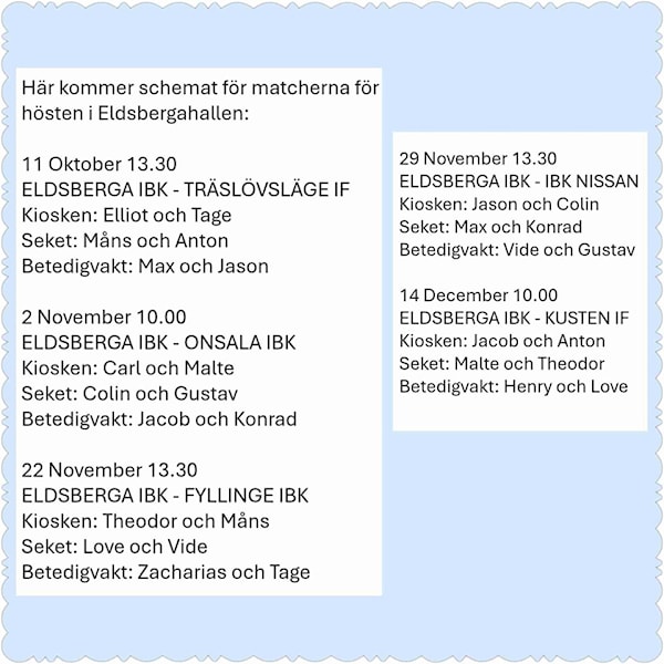 En sak till, om det är så att man missar sitt uppdrag så får man vara beredd på att ställa upp med kort varsel en annan gång om det fattas folk. Vi gör ju detta för våra killar! Tack🙏