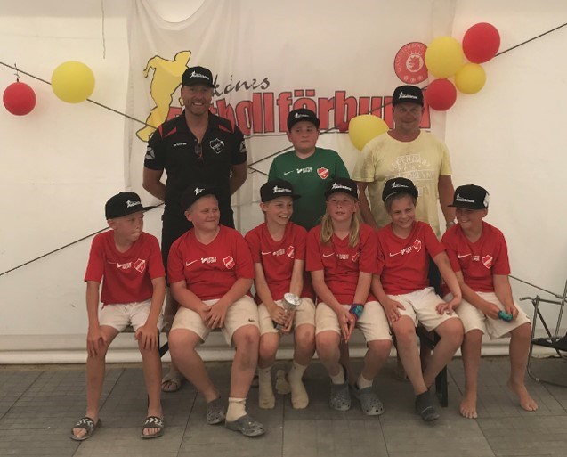 Med det bästa tänkbara vädret med strålande sol och klarblå himmel väntade en spännande och roligt fotbollsturnering nere på beachen i Åhus under 2 härliga och mycket roliga dagar för våra grabbar! Vi hade fixat ett lagtält att kunna samlas i inför matcherna och givetvis mellan matcherna. Första matchen stundade Veberöds AIF för motståndet och det blev en jämn batalj, där våra grabbar hade det mesta bollinnehavet på deras planhalva. Inga mål i matchen – men en spännande och rolig match med en duktig domare som assisterade grabbarna vid behov. Inför turneringen hade de flesta en inställning att en machtid på ”bara” 10 minuter är en baggis…men efter matchen var det svettiga pannor och en mer förstående inställning att 10 minuter i högsta tempo är ganska krävande…det väntade hela 5st matcher under första matchdagen och ytterligare 5st under andra och sista matchdagen! Nu till lagtältet för intaga mer energi inför derby matchen mot Tollarp… Andra matchen var det nog mest fokus på att det var derby och vilka spelare hade motståndarna tagit ut mot oss…det blev en jämn match mot dem…men målmässigt studsade bollen deras väg varav ett kom från ett snyggt skott i bortre hörnan från målvaktens sida… Nu var det dags för lunchbuffén som var en succé…grabbarna höll ihop som vanligt och satt tillsammans och det var välfyllda mattallrikar och med lite ”extra” dricka till vissa :-) Inför tredje matchen stod Hässleholms IF för motståndet…vilka mål vi fick skåda :-) :-) :-) Även denna match mycket kämpa och vilja och vi fick nu se grabbarnas första mål…Fabian längs vänsterkanten lyckas göra en snurrfint i sanden och sätta dit den…MÅÅLLL!!! Stort jubel på läkaren!!! Vi slår in en boll som Erik är längst framme och trycker dit….MÅÅLLL!!! Jubel och glädje löpningar!!! Johannes kommer nära målet nere till vänster och gör en ”Rabona” (spark bakom stödje benet)…MÅÅLLL!!! Jubel och glädje hyllningar!!! Med 10 sek kvar lyckas de få till ett långskott som blir till en perfekt lobb och det blev kvitterat… Matchen var helt fantastisk att skåda och uppleva och se denna lycka som grabbarna hade efter varje mål!!! Vilket lir de alla bjöd på!!! Nu var det bad i havet som gällde för svalka ner sig i sommarvärmen! Nästa match under eftermiddagen stod FC Bellevue…uttalet fick Martin göra varje gång vi hade samling :-) …En match som vi spelade mycket bra i men de lyckades få in första målet…vi kämpade på bra och det lönade sig. Vi fick ett inkast/inspark längs långsidan som Otto lade upp för inspark…pekade mot Johannes vid bortre stolpen…lägger in den…Johannes sätter dit den med en perfekt nick…MÅÅLLL!!! Jubel och glädje!!! En stund senare efter ett par svettiga målvaktsräddningar var det dags igen – ny inspark från i princip samma plats…Otto lägger in den mot Johannes på samma plats…nu sätter han dit den med låret…MÅÅLLL!!! Jubel av oss alla!!! Mycket bra spelat av alla på plan under hela matchen!!! Nu väntade sista matchen kl 19.00 (!!!)…efter en lång dag stod Staffanstorp United FC för motståndet. Vi börjar riktigt bra och trycker dit ett par farliga skott mot deras mål…de kontrar ett par gånger med långa utkast…det är stor fördel att ha medvind (PS: tror bestämt vi hade motvind i samtliga matcher – detta berodde på vilken sida domaren satt på för de skulle kunna få ”rätt” med hemma borta enligt deras padda)… Vi får en straff och Erik stegar fram…gör en ring i sanden med bollen och lägger upp den...trycker dit den hur säkert som helst nere vid högra stolpen…otagbar!!! MÅÅLLL!!! Jubel av oss alla!!! En bra genomförd match och en bra dag för oss alla med mycket roligt tillsammans!!! Dag två på beachen…samling kl 09.15 och med sista matchen kl 19.00…en ny lång dag väntar grabbarna. Första matchen spelar vi på centercourten mot Hässleholms IF – spännande upplevelse att få träda in på centercourten och lira…matchen blev som igår jämn och det avgörande var återigen vind och studsarna på sanddynorna…Erik kom loss i ett friläge och säkert dit den med ett rungande skott…MÅÅLL!!! Vi fick äran att lira hela 3st av våra matcher på centercourten denna avslutande dag – vilken härlig känsla för boysen! Vi mötte FC Bellevue, Veberöd, Lev 06 och sista matchen mot Kristianstad FC och samtliga matcher blev tuffa och välspelade. Dagen innehöll även denna en gemensam lunchbuffé och härligt havsbad med många skratt!!! Det var även tävling på centercourten med ”träffa ribban”…vi fick både Fabian och Otto som lyckades klara utmaningen att bli bland de 30st första att klara det! Alla boysen gav 100% i alla matcher både på och utanför planen och slitet och mödan med ett gott uppförande lönade sig… Everöds IF blev belönade för sitt uppförande med få tilldelat sig turneringens fairplay pris utdelat av Skånes fotbollsförbund…förutom äran att vinna utnämningen fick grabbarna varsin keps och en stor pokal!!! (bilder på instagram/Skånesfotbollsförbund) Ett stort tack till er alla sköna lirare och vinnare!!! – det var verkligen två roliga dagar med er: Erik, Johannes, Fabian, Jakob, Melker, Måns, Otto PS: Tack för sommarpresenten – pizza sten och lite lakrits – ska bli gott i sommar! :-) :-) :-) Den bästa sommaren till er och era familjer – ta vara på er!!! /Tränarna