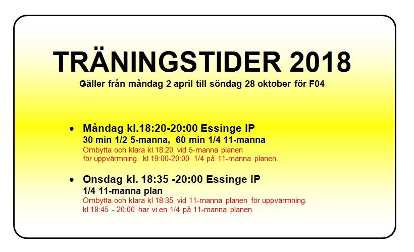 TRÄNINGSTIDER 2018 Gäller från måndag 2 april till söndag 28 oktober för F04 Måndag kl.18:20-20:00 Essinge IP 30 min 1/2 5-manna, 60 min 1/4 11-manna. Ombytta och klara kl 18:20 vid 5-manna planen för uppvärmning. kl 19:00-20:00 1/4 på 11-manna planen. Onsdag kl. 18:35 -20:00 Essinge IP 1/4 11-manna plan. Ombytta och klara kl 18:35 vid 11-manna planen för uppvärmning. kl 18:45 - 20:00 har vi en 1/4 på 11-manna planen. F-04 28 mar 2018 0kommentarer