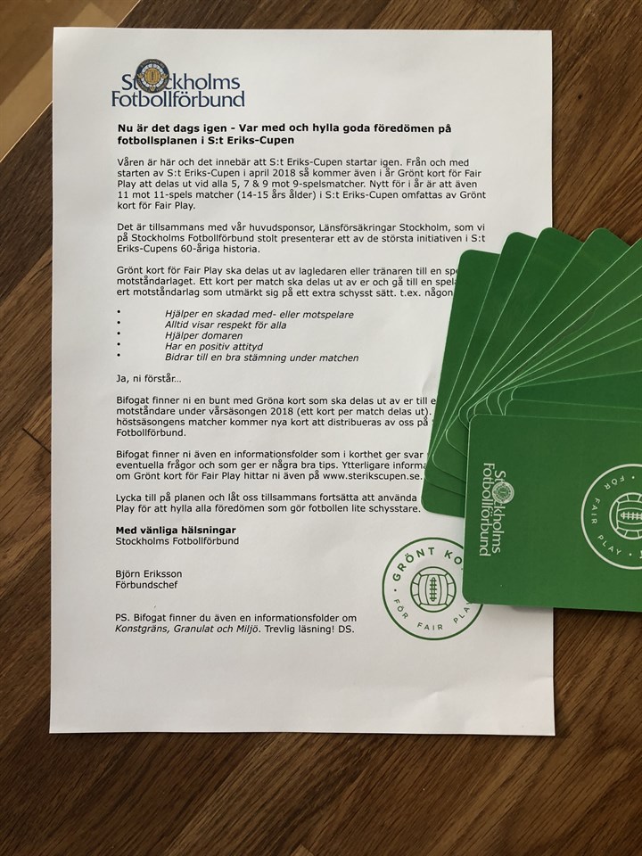 StFF har beslutat att GRÖNT KORT kommer att delas ut i 11-mot 11 matcher (14-15 år) för Fair Play. Ett uppskattat initiativ som vi med glädje stödjer. Så för oss som inte fick något GRÖNT KORT, så har vi nu chansen att förvärva ett.