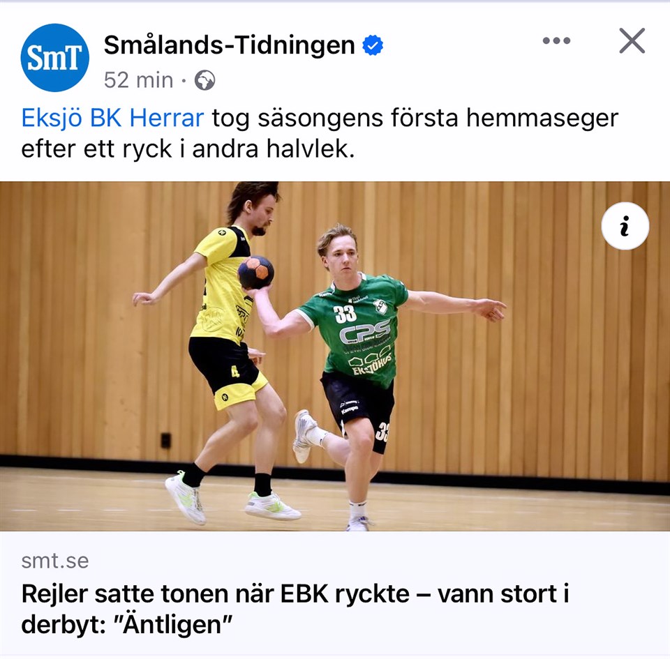 Äntligen kom första hemmasegern för säsongen! Den kom i derbymatchen mot @hultsfredhfherr! Första halvlek var en jämn halvlek där vi brände lite för mycket lägen framåt och Hultsfred tog vara på sina lägen. Halvtidsresultatet skrevs till 16-15. Andra halvlek startade vi i ett högt tempo och fick träff bakåt som generade i enkla mål framåt i både första och andrafas. Slutresultatet skrevs tillslut till 36-26. In och läs mer om matchen i @smalandstidningen reportage👍? Eksjö BK Herr 12 nov 2023 0kommentarer