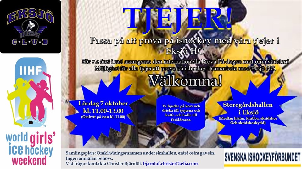 TJEJER! Lördag 7 oktober kl. 11.00-13.00 (Ombytt på isen kl. 11.00) För 7.e året i rad arrangeras den internationella Prova På-dagen runt om i världen! Möjlighet för alla tjejer att prova på ishockey i samarbete med Eksjö HC. Vi bjuder på korv och dricka till tjejerna och kaffe och bulle till föräldrarna. Samlingsplats: Omklädningsrummen under simhallen, östra gaveln. Ingen anmälan behövs. Plats Storegårdshallen i Eksjö (Medtag hjälm, klubba, skridskor och skridskoskydd). Vid frågor kontakta Christer Bjärnlöf. bjarnlof.christer@telia.com - Välkomna! Eksjö HC 2 okt 2017 0kommentarer