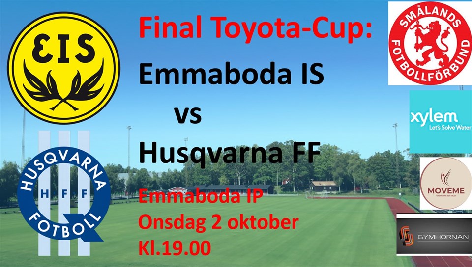 Final Toyota Cup: Emmaboda IS - Husqvarna FF Idag Onsdag 2 oktober. Kl.19.00 Emmaboda IP Det är dags för final i Toyota Cup. Idag hälsar vi de regerande cupmästarna, Husqvarna FF, välkomna till Emmaboda IP. Husqvarna FF är även med i toppstriden i div 1 och det kommer att bli en häftig utmaning för oss. Till matchen, precis som tidigare matcher, behöver alla ha med sig bra fokus, inställning och vilja. Vi måste direkt och själva få igång vårt driv, engagemang, jobb och slit. Detta för att få igång vårt spel, så ska vi ge bortalaget en match. Vi måste ta det tuffa jobbet över hela planen, hela vägen och som lag, samt med riktigt bra energi, så ska vi göra en bra insats med bra prestation. Enligt prognos ska det bli bra fotbollsväder och vi hoppas på en trevlig fotbollsmatch. Vi hoppas många vill komma och stötta Emmaboda kommuns bästa lag. Vi kommer att uppdatera via appen Min Fotboll! Vi kommer att livesända matchen på Min Fotboll! Vi kan, Vi vill, Vi vågar, Vi gör. Emmaboda kommuns bästa lag, Emmaboda IS Dam! Truppen är: 1. Lina Gustafsson 5. Ronja Berg 7. Moa Petersson 8. Sandra Berg 9. Linnea Hultenius 11. Wilma Eriksson 12. Miranda Gjakova 14. Alma Sternegård 15. Alice Larsson 17. Matilda Axelsson 18. Emelié Hyberneth 21. Jenny Johansson 22. Emelie Zakrisson 23. Amelia Malmquist 24. Emelie Joelsson 26. Ellinor Zakrisson 29. Tilde Elgborn 31. Maya Sandqvist