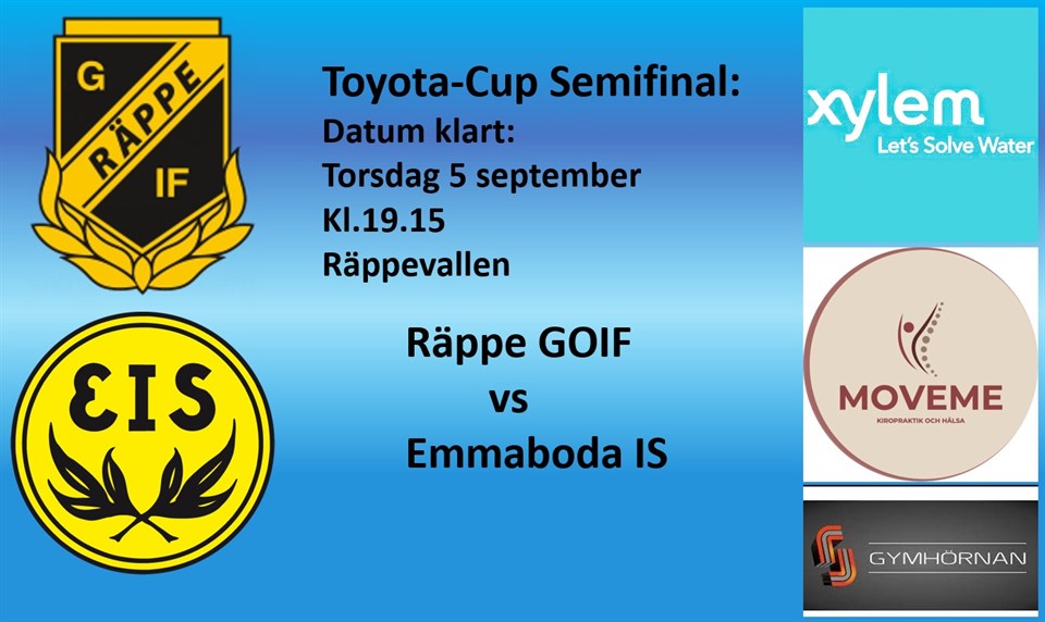 Toyota Cup Semifinal: Räppe GOIF - Emmaboda IS Torsdag 5 september. Kl.19.15 Räppevallen