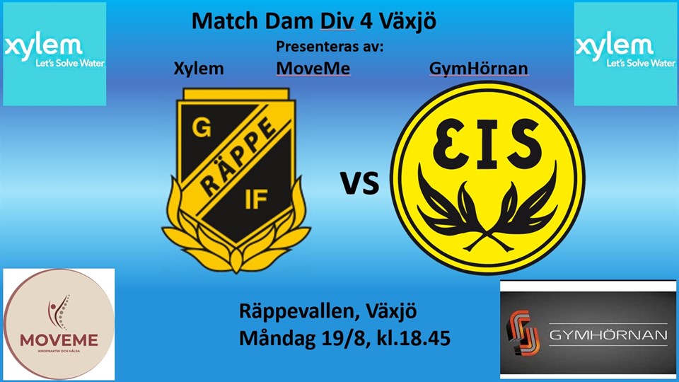Idag måndag åker vi till Växjö för första matchen i div 4 efter sommarledigheten. Vi möter Räppe GOIF i div 4 Växjö Dam. Räppe har gjort det bra i serien och ligger 2:a. När vi möttes på Emmaboda IP var Räppe starka i sin defensiv och lyckades vinna med 0-2. Vi är revanschsugna. Dock kan vi förvänta oss att det blir en tuff match. Till matchen idag, precis som tidigare matcher, behöver alla ha med sig bra fokus, inställning och vilja. Vi måste direkt och själva få igång vårt driv, engagemang, jobb och slit. Detta för att få igång vårt spel, så ska vi ge hemmalaget en match. Vi måste ta det tuffa jobbet över hela planen, hela vägen och som lag, samt med riktigt bra energi, så ska vi göra en bra insats med bra prestation. Matchen spelas på Räppevallen, Växjö, kl 18.45, måndag den 19 augusti. Enligt prognos ska det bli bra fotbollsväder och vi hoppas på en trevlig fotbollsmatch. Vi hoppas många vill komma och stötta Emmaboda kommuns bästa lag. Vi kommer att uppdatera via appen Min Fotboll! Vi kommer att livesända matchen på Min Fotboll! Aktuell tabell: Denna Vi kan, Vi vill, Vi vågar, Vi gör. Emmaboda kommuns bästa lag, Emmaboda IS Dam! Truppen är: 37. Matilda Fransson (mv) 2. Vera Elmstrand 3. Gerda Jonsson 4. Agnes Elgborn 6. Nora Strand 9. Linnea Hultenius 11. Wilma Eriksson 16. Majken Simonsson 19. Marlene Lennartsson 21. Jenny Johansson 22. Emelie Zakrisson 26. Ellinor Zakrisson 28. Maja Edberg 32. Wilma Fyhr
