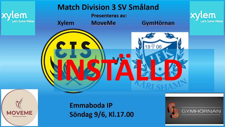Matchen på söndag 9 juni, Div 3 SV Dam, mellan Emmaboda IS - IFK Karlshamn är inställd. IFK Karlshamn har lämnat wo och Emmaboda IS har tilldelats 3-0 som resultat. Aktuell tabell: Denna Nästa match för Emmaboda IS i Div 3 är borta mot Växjö BK, söndag 16 juni, kl.17.00. Nästa match för Emmaboda IS i Div 4 är borta mot Ingelstads IK, onsdag 12 juni, kl.19.00.