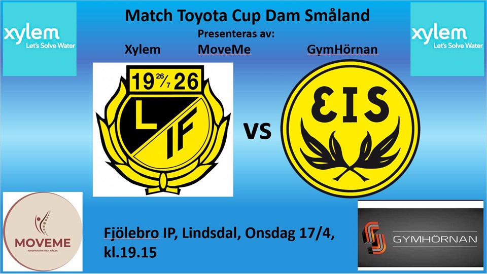 Imorgon onsdag fortsätter Toyota Cup med bortamatch. Vi åker till Fjölebro IP för att ta oss an Lindsdals IF. Gruppspelet genomfördes på ett riktigt bra sätt och vi var gruppetta efter 3 segrar. Vi mötte Lindsdal även förra året i samma omgång som nu och vann då med 3-2 på bortaplan. I söndags hade vi seriepremiär och det blev en bra seriestart med vinst mot Ronneby BK. Även Lindsdal spelade och mötte Madesjö i premiären av div 3 SÖ Dam och här lyckades Madesjö vinna. Upplagt för en spännande cupmatch och som ska avgöras på onsdagskvällen. Vi behöver alla, precis som senast, vara laddade och på hugget från start. Jobbet måste fortsatt vara tufft och hårt över hela planen, hela vägen och som lag. Vi måste få igång vårt driv, engagemang, jobb och slit, för att få igång vårt spel, så ska vi ge hemmalaget en match. Det tillsammans med rätt inställning och fokus så ska vi göra en bra insats med bra prestation. Matchen spelas på Fjölebro IP, Lindsdal, onsdag den 17 april, kl. 19.15. Enligt prognos ska det bli bra fotbollsväder och vi hoppas på en trevlig fotbollsmatch. Vi hoppas många kommer och stöttar Emmaboda IS Dam. Vi kommer att uppdatera via appen Min Fotboll! Vi kommer att livesända matchen på Min Fotboll. Vi kan, Vi vill, Vi vågar, Vi gör. Emmaboda kommuns bästa lag, Emmaboda IS Dam! Truppen är: 55. Elvira Runesson (mv) 2. Vera Elmstrand 5. Ronja Berg 7. Moa Petersson 8. Sandra Berg 11. Wilma Eriksson 12. Miranda Gjakova 14. Alma Sternegård 15. Alice Larsson 17. Matilda Axelsson 19. Marlene Lennartsson 21. Jenny Johansson 23. Amelia Malmquist 26. Ellinor Zakrisson 29. Tilde Elgborn