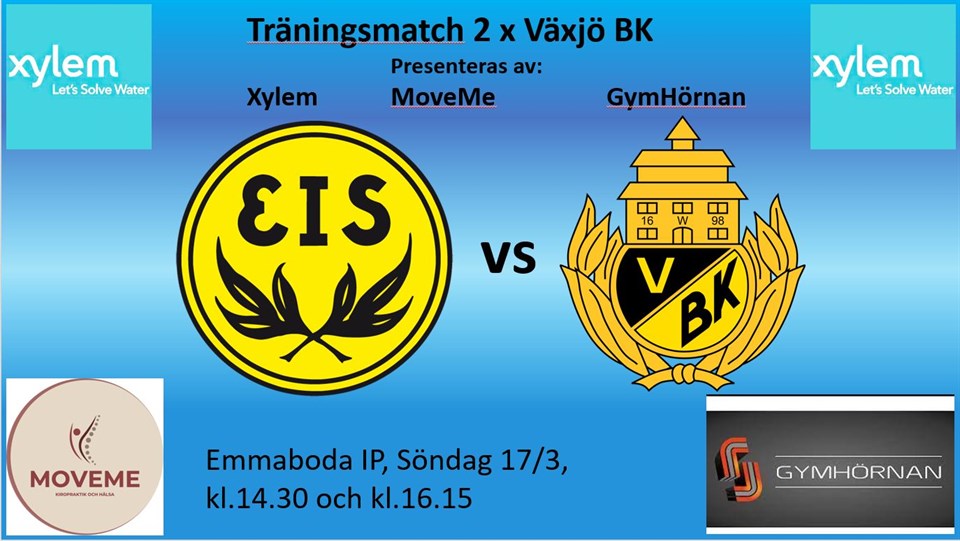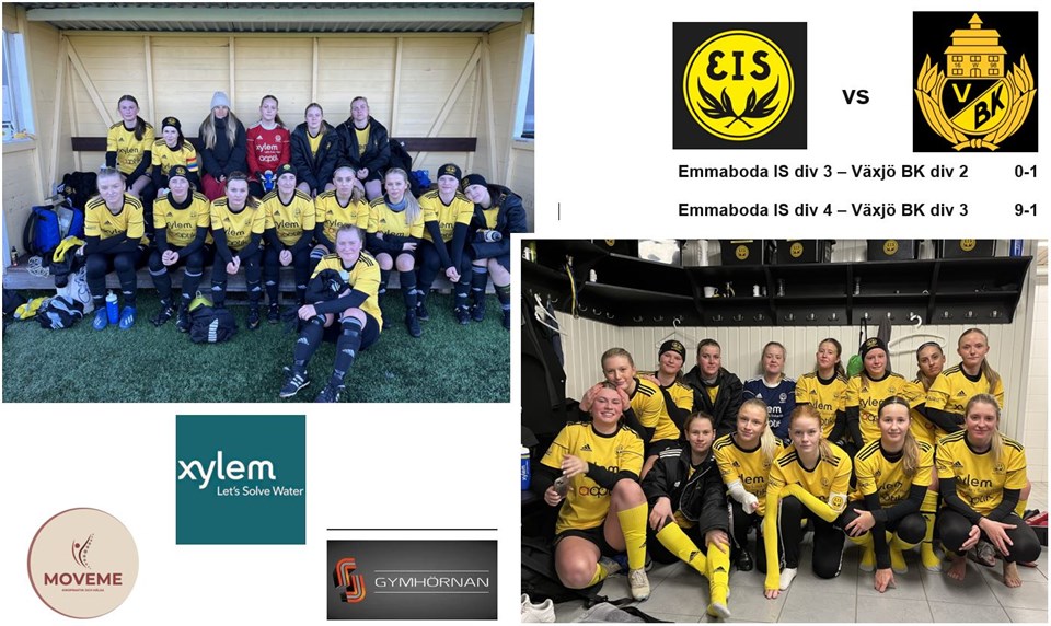 Imorgon, söndag, har vi 2 träningsmatcher. Vi välkomnar Växjö BK till Emmaboda IP. Vi är mitt uppe i försäsongsträningen och kör för fullt. I fredags hade vi andra gruppmatchen i Toyota Cup och vann med 7-0 borta mot Kalmar AIK. Matcherna spelas på Emmaboda IP, konstgräsplan, söndag den 17 mars, kl. 14.30 och kl. 16.15. Enligt prognos ska det bli bra fotbollsväder och vi hoppas på trevliga fotbollsmatcher. Vi kommer att uppdatera via appen Min Fotboll! Vi kommer att livesända matchen på Min Fotboll. Vi kan, Vi vill, Vi vågar, Vi gör. Emmaboda kommuns bästa lag, Emmaboda IS Dam! Truppen div 3 är: (första matchen) 112. Elvira Runesson (mv) 2. Vera Elmstrand 6. Nora Strand 7. Moa Petersson 8. Sandra Berg 11. Wilma Eriksson 12. Miranda Gjakova 18. Emelié Hyberneth 23. Amelia Malmquist 27. Maja Gustavsson 29. Tilde Elgborn 30. Alice Larsson 31. Jenny Johansson 32. Wilma Fyhr Truppen div 4 är: (andra matchen) 1. Lina Gustafsson 3. Gerda Jonsson 4. Agnes Elgborn 5. Ronja Berg 14. Alma Sternegård 15. Maya Sandqvist 16. Majken Simonsson 17. Matilda Axelsson 19. Marlene Lennartsson 25. Molly Sandström 26. Ellinor Zakrisson 28. Maja Edberg 33. Louise Lorentzon