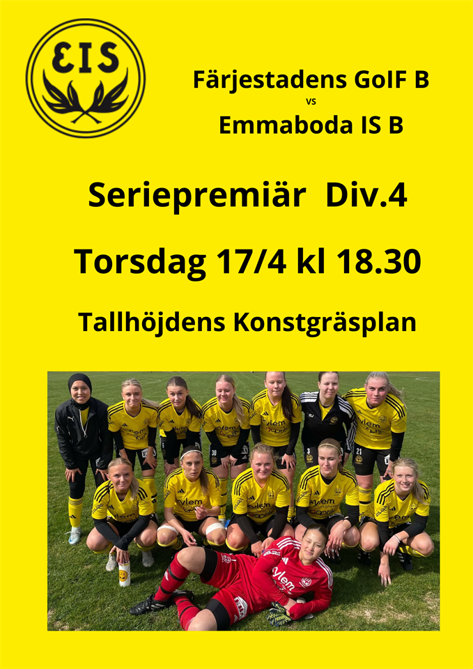 På måndag är det så hemmapremiär för B-laget i Div.4 som då tar emot Nättraby / Hasslö. Vi spelar på Emmaboda IP kl 19.15. OBS vi har fått info om att vi ska använda den "riktiga" entren uppe vid parkeringen utanför kansliet. Nåtrraby / Hasslö vann sin premiär mot Kalmar AIK med 2-1 vilket imponerar lite. Även vi vann ju vår premiär borta mot Färjestaden, så blir ett intressant möte. Vi hoppas vi kan sända matchen live via Min Fotboll appen som vi brukar göra. Följ oss gärna även på Instagram och Tik Tok där vi försöker uppdater på matchdagarna. Uttagen trupp: 55. Elvira Runesson 3. Gerda Jonsson 4. Agnes Elgborn 5. Ronja Berg 6. Nora Strand 16. Majken Simonsson 19. Marlene Lennartsson 22. Mirelle larsson 26. Louise Lorentzon 27. Maja Gustavsson 28. BasBibi Akbari 30. Sanna Bremer 32. Wilma Fyhr