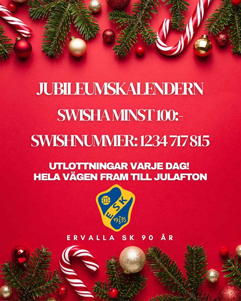 ESKs julkalender är tillbaka, succén från 2020 under Coronans bistra tider med en lucköppning varje dag kommer äga rum igen som avslutning på jubileumsåret. Bakom varje lucka finner man en julklapp skänkt av våra samarbetspartners, där dras också en person som bidragit med minst 100:- till Ervalla SK under nov/dec 2025. Följ insamlingen / jubileumskalendern löpande via denna sidan samt i våra sociala medier, 2020 inbringade lucköppningarna över 20 000:- och vad summan landar på under slutklämmen av vårt 90-års firande återstår att se. Insamlingen sköts av ESKs fotbollsektion och pengarna öronmärks "till driften av Lyckevallen". Vår idylliska och natursköna idrottsplats behöver ständigt underhållas och morderniseras. Varmt välkomna att bidra och deltaga under årets sista månader. Så här gör du för att deltaga; Bidra med minst 100:- eller mer via swish under nov/dec. Märk din swish med "ESK-90år" då är ditt namn med i lucköppningarna Ervalla SKs swish; 123 4717 815 Sprid detta initiativ till vänner, bekanta, grannar och andra intresserade så blir vi många som följer detta under slutspurten av jubileumssäsongen 2025.