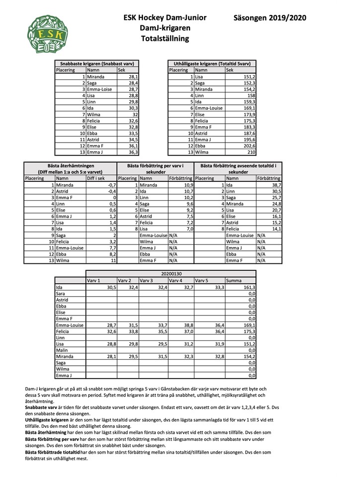 Än en gång bra krigat av tjejerna. En hel del bortfall i sista sekund pga sjukdomar. Bådar inte gott inför helgens viktiga matcher. Krya på er. Veckan snabbaste krigare blev Miranda som tog sig upp för backen på rekordtiden 28,1 sek. Tätt följt av Nykomlingen Emma-Louise på 28,7 och Lisa på 28,8. Uthålligaste krigaren blev Lisa med ny rekordtid på 151,2sek. Bra jobbat än en gång och det syns tydligt att träningen ger effekt. Juniorlag Damer 30 jan 2020 0kommentarer