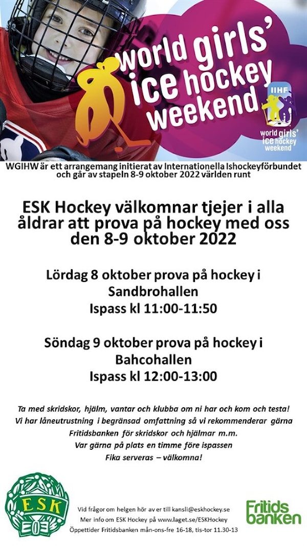 ESK Hockey välkomnar tjejer i alla åldrar att prova på hockey med oss den 8-9 oktober 2022