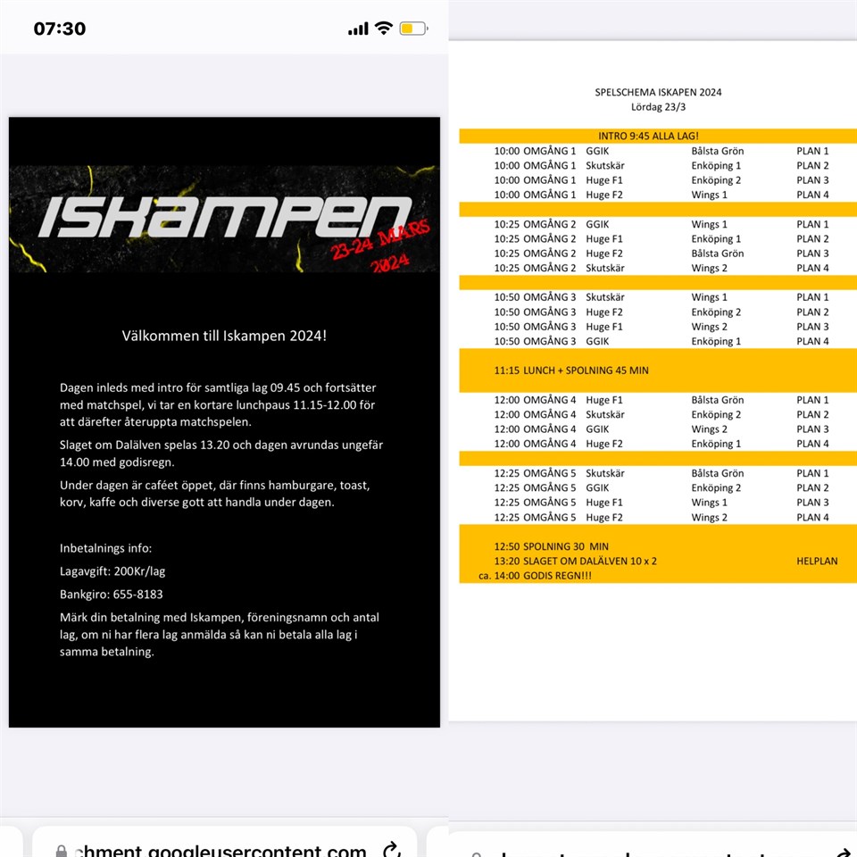 Hej alla . Ber om ursäkt att info har dröjt. Men i går kväll fick jag spelschema och upplägg inför helgens Iskamp i Tierp för Team 16 . Ni som är berörda av detta har redan anmält er på kallelse men kommer få ut en ny kallelse idag med tider och aktivitetsinfo . Vi kommer att ha 2 lag som senast i Märsta. Kommer även lägga med en fråga om man kan tänka sig att vara målvakt nån match om tillfälle ges . Vid frågor är det bara höra av sig till mig på 0733554103. Jätte viktigt med skridskoskydd och halsskydd denna dag . Hockeyskola 20 mar 2024 0kommentarer