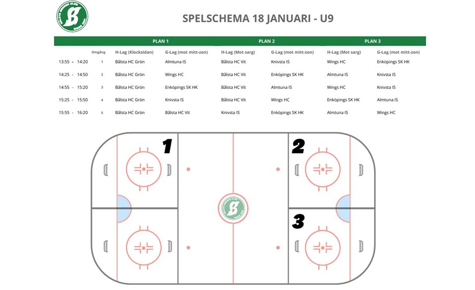 Hej. Här kommer spelschemat för poolspelet hemma 25/1 Samling bahco: 10:15 Första match: 11:15 Spelare: Aaron Eriksson Gustav Håkansson Hjalmar Sigurd Lion Lidmo Ludwig Rämström Mio Alvemark Aston Aspengren Svante Brolin Vilmer Tingvall Vincent Aspenfred Ledare på is; Torbjörn Tingvall Jörgen Lidmo Johan Sigurd William Aspengren Ledare utanför isen; Lars Brolin Kristofer Eriksson Katrine Baltzer Matchtröjor delats ut på plats av oss ledare och ska lämnas tillbaka direkt efter poolspelet. Vi ska spela 5 matcher där vi har inlagt en paus på 45 min för att fylla på med energi. Våra kära ESK spelare kommer erbjudas gratis korv m bröd, toast eller hamburgare + dricka. Kiosken kommer vara öppen för försäljning till övriga. Medtag skridskoskydd. Hoppas på att många vill komma och heja fram ESK. // Mvh Katrine genom ledarna Team 16 21 jan 0kommentarer