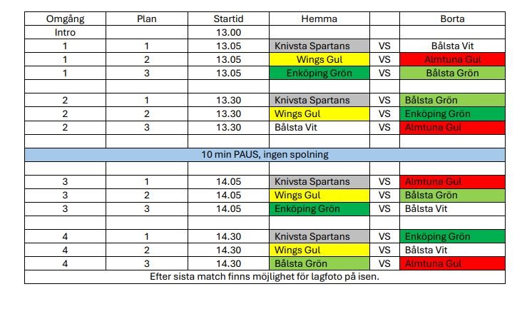 God kväll, Här kommer spelschema för poolspelet i Märsta 17/11 Samling: 13:00 Första match: 14:00 Spelare Aaron Eriksson Aston Aspengren Calle Carlsson Eskil Hellberg Gustav Håkansson Lion Lidmo Mikail Kllic Märta Ljungberg Vincent Aspenfred Ledare Kristoffer Eriksson William Aspengren Rasmus Carlsson Katrine Baltzer Matchtröjor delas ut på plats av oss ledare och ska lämnas tillbaka direkt efter poolspelet. Tänk på att få i spelarna lunch och mellanmål så de får i sig energi mellan matcherna. Det är väldigt vanligt att de blir låga på energi och tappar fokus annars. Vänligen ta INTE med nötter, pga. allergi.