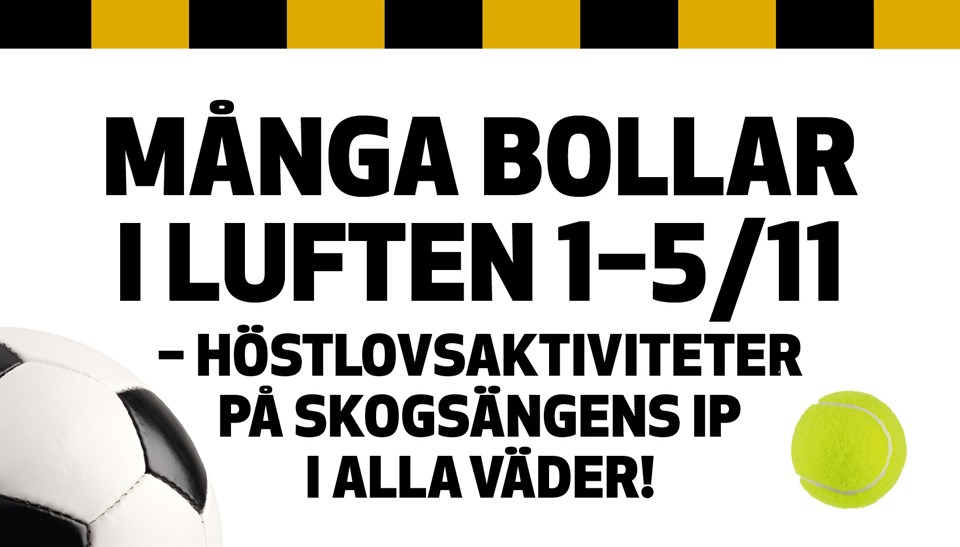 1–5 november kl. 10–12 anordnar Södra FF, med stöd från Eskilstuna kommun, höstlovsaktiviteter på Skogsängens IP:s konstgräs. Aktiviteterna riktar sig till både tjejer och killar, Södraspelare och alla andra. Det vankas spontanfotboll, fotbollsskola för de minsta, minitennis, pingis, hinderbana och mycket annat. Och allting är gratis. Det krävs ingen anmälan, utan det är bara att dyka upp. Glöm inte vattenflaska, bra skor och varma kläder och gott humör! Om det ösregnar eller snöar? Då ställer vi in, men annars kör vi! Läs mer här!