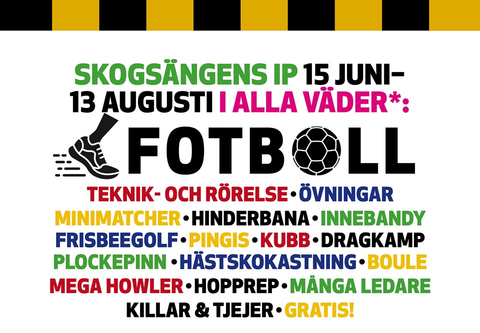 Södra FF kommer med stöd av Eskilstuna kommun och Sparbanksstiftelsen Rekarne att anordna kostnadsfria aktiviteter på Skogsängens IP under nio veckor i sommar, från 15 juni till 13 augusti. På konstgräset tisdag, onsdag och fredag kl. 11–14 – så länge det INTE åskar eller ösregnar. Det är gratis att delta, någon anmälan behövs inte, inte heller medlemskap. Men ta med vattenflaska, spring i benen och gott humör. Se pdf! På plats finns både Södraledare och feriepraktikanter. Tisdagar Kl. 11–14: Drop in-fotboll och massor av andra aktiviteter (från 5 år). Kl. 11–12: Fotbollsskola för flickor och pojkar som fyller 5–8 år 2021. Lek, fotboll och minimatcher 3 mot 3. Kl. 13–14: Träning för pojkar födda 2006–2009. Onsdagar Kl. 11–14: Drop in-fotboll och massor av andra aktiviteter (5–15 år). Kl. 12.30–14: Fotbollsträning för tjejer (födda 2008–2012). Övningar och minimatcher. Fredagar Kl. 11–14: Drop in-fotboll och massor av andra aktiviteter (från 5 år). Kl. 11–12: Fotbollsskola för flickor och pojkar som fyller 5–8 år 2021. Lek, fotboll och minimatcher 3 mot 3. Har du frågor? Kontakta Södra FF via mejl (sodraff@gmail.com) eller skicka SMS till Mikael Jeppe, 070-646 20 98.