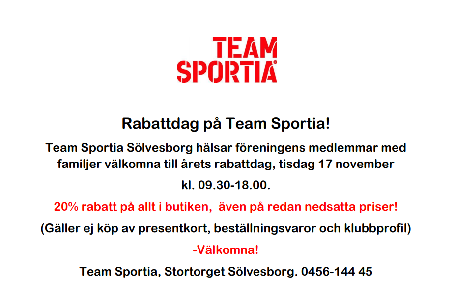 Tisdagen den 17:e November är det rabattdag på Team Sportia för föreningens alla medlemmar. 20 % rabatt på allt i butiken, även på nedsatta priset! 17 November kl: 09:30 - 18:00. /EIF Edenryds IF 5 nov 2020 0kommentarer